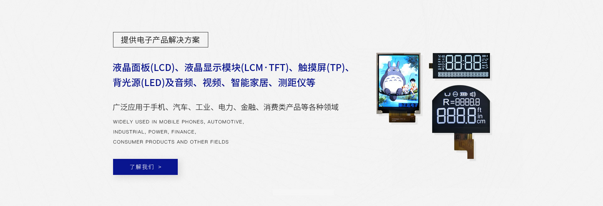 專(zhuān)業(yè)設(shè)計(jì)、生產(chǎn)液晶面板(LCD)、液晶顯示模塊(LCM·TFT)、觸摸屏(TP)、背光源(LED)及音頻、視頻、智能家居、測(cè)距儀等